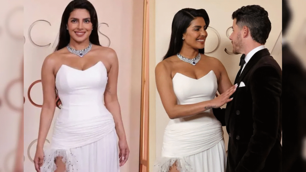 इस खास मौके के लिए, प्रियंका ने मशहूर फैशन हाउस डायर का कस्टम-डिज़ाइन किया हुआ सफेद स्ट्रैपलेस गाउन चुना। इस गाउन ने उन्हें बेहद एलिगेंट और ग्लैमरस लुक दिया। गाउन में मौजूद हाई स्लिट और फेदर डिटेलिंग ने इस पूरे आउटफिट को और भी ज़्यादा आकर्षक बना दिया। प्रियंका ने अपने लुक को एक शानदार डायमंड नेकलेस और मैचिंग स्टड इयररिंग्स के साथ पूरा किया। वहीं, उन्होंने अपना मेकअप सॉफ्ट और क्लासी रखा, जिससे उनकी शालीनता और भी ज़्यादा निखरकर सामने आई।