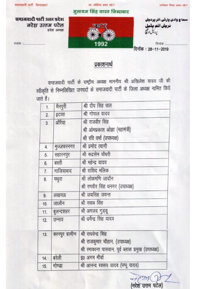 इसके अलावा, मथुरा का जिलाध्यक्ष लोकमणि जादौन, लखनऊ का जिलाध्यक्ष जयसिंह जयंत, जालौन का जिलाध्यक्ष नवाब सिंह, बुलंदशहर का जिलाध्यक्ष अमजद गुड्डू, उन्नाव का जिलाध्यक्ष धर्मेंद्र सिंह यादव, कानपुर ग्रामीण का जिलाध्यक्ष राघवेंद्र सिंह, बरेली का अगम मौर्या व गोंडा का जिलाध्यक्ष आनंद स्वरूप यादव को बनाया गया है।